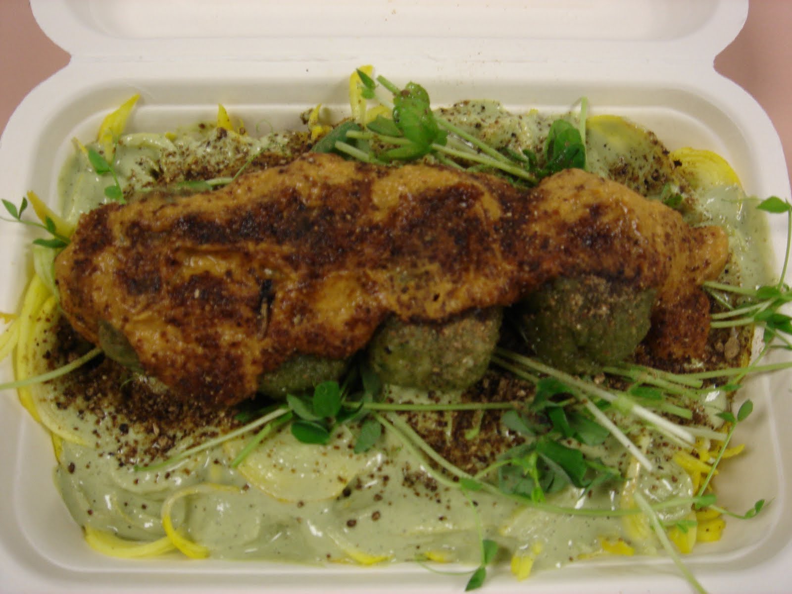 This rich, raw vegan dish featured raw gnocchi topped with a savory carbonara sauce over shredded yellow zucchini noodles with some sprouts and a creamy sauce.