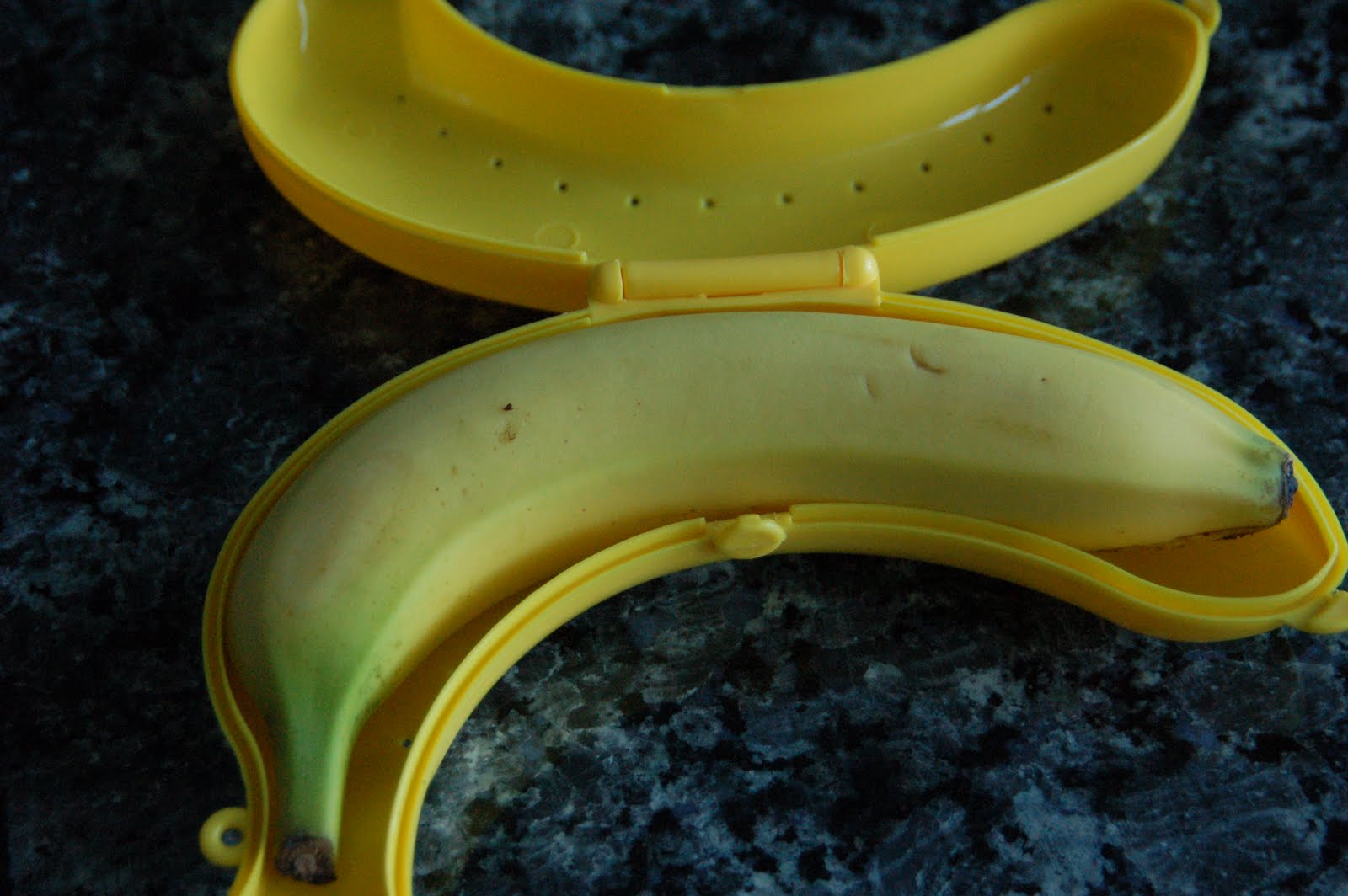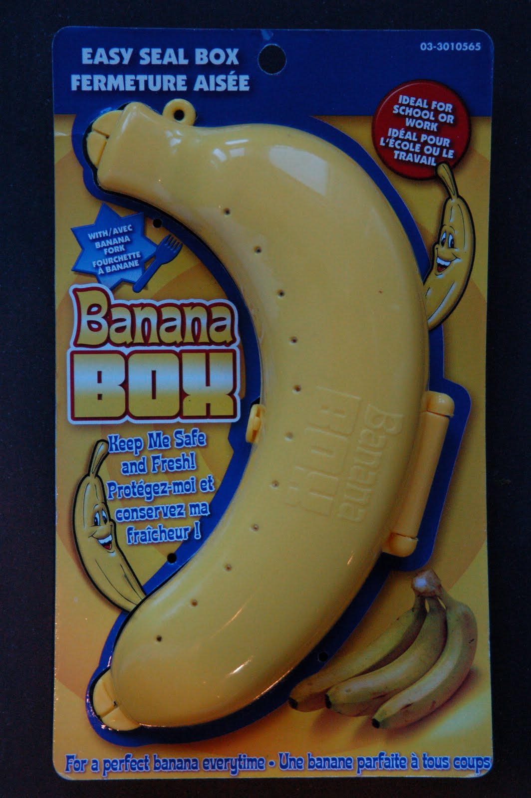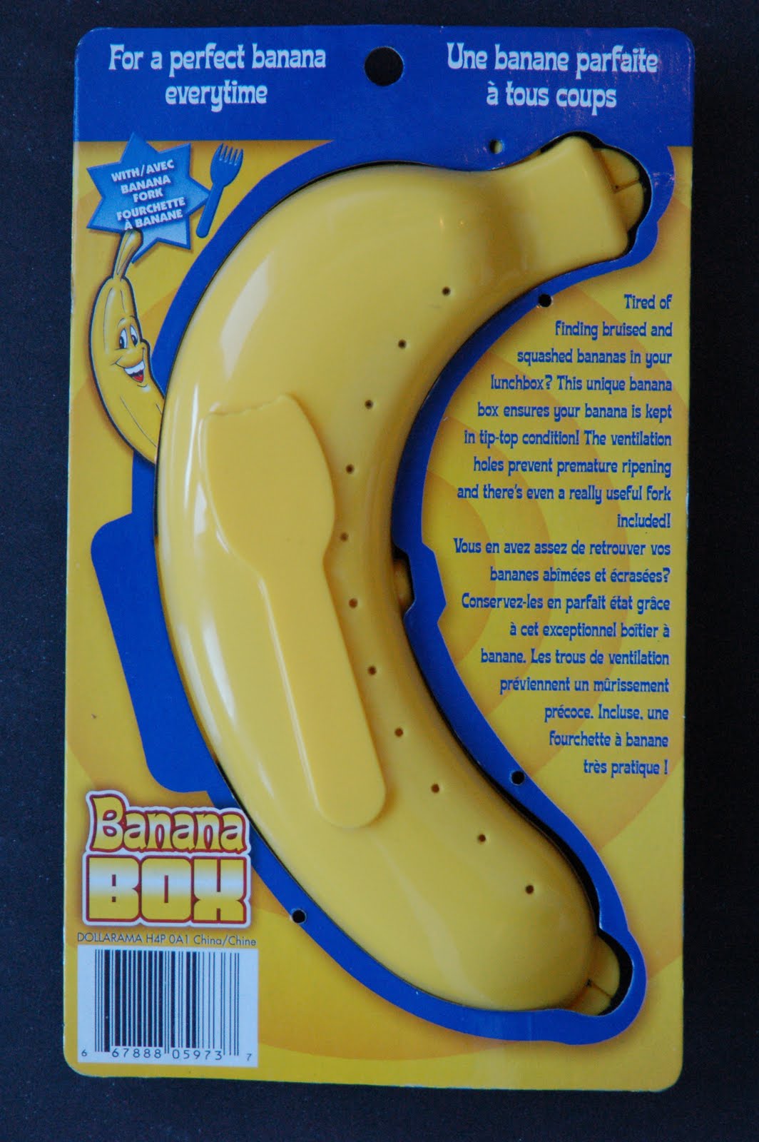 Bananas are such a nutritious snack, but just try to pack them anywhere and they always end up bruised, blackened and mushy. Not so appetizing. So when I ran into our local dollar store to pick up some office supplies and spotted this useful item, I grabbed it. Little did I know that it would provide hours of entertainment for our whole family – how is this for a ridiculous idea: A banana fork! Who on earth would ever use a tiny fork to eat their banana! I still think the actual banana holder is a great idea, but the fork? Not so much.